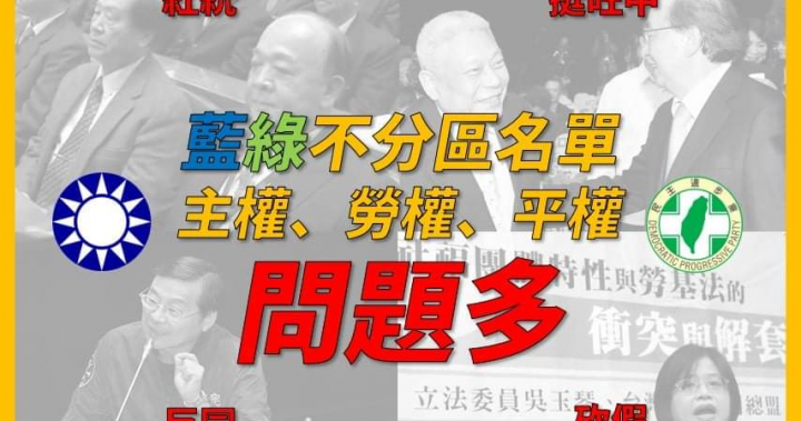 藍綠不分區立委名單爭議彙整 藍紅統反同、綠血汗砍假 幾經波折以後,國民黨與民進黨的不分區立委提名名單終於在昨天確定。這兩份名單都因為各自的爭議而受到激烈的議論。我從自己最關心的 #主權、#勞權、#平權 三大面向檢視藍綠的不分區名單,整理出如下的對照,發現: 國民黨名單主要的問題在於許多人士支持統一、藍綠不分區立委名單爭議彙整 藍紅統反同、綠血汗砍假 幾經波折以後,國民黨與民進黨的不分區立委提名名單終於在昨天確定。這兩份名單都因為各自的爭議而受到激烈的議論。我從自己最關心的 #主權、#勞權、#平權 三大面向檢視藍綠的不分區名單,整理出如下的對照,發現: 國民黨名單主要的問題在於許多人士支持統一、藍綠不分區立委名單爭議彙整 藍紅統反同、綠血汗砍假 幾經波折以後,國民黨與民進黨的不分區立委提名名單終於在昨天確定。這兩份名單都因為各自的爭議而受到激烈的議論。我從自己最關心的 #主權、#勞權、#平權 三大面向檢視藍綠的不分區名單,整理出如下的對照,發現: 國民黨名單主要的問題在於許多人士支持統一、
